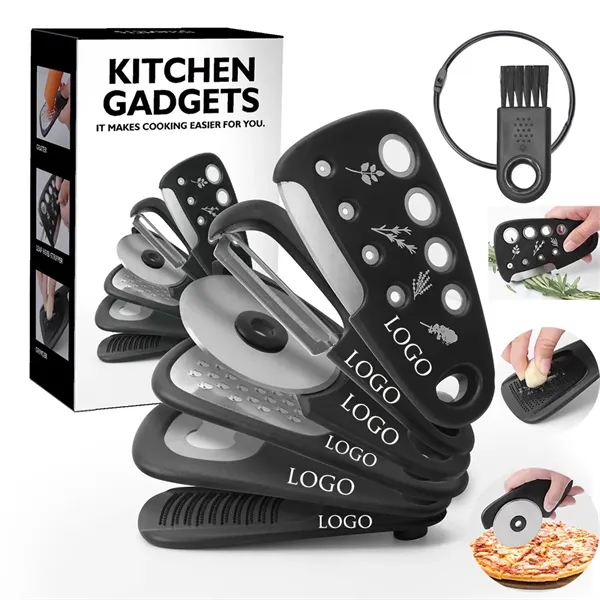 This kitchen knives set is made stainless steel. Set includes 1 grater for cheeses,vegetables,chocolate;1 grinder for garlic or ginger;1 pizza cutter / wheel for pizzas and flat breads;1 bottle opener;1 swivel peeler for vegetables and fruits,1 paring knife for vegetable and fruits. The space saving design allows each gadgets can be stacked on top of each other in no particular order, you can simply put it in your kitchen drawer. The functionality of multiple kitchen tools in just one, highly versatile, kitchen gadget.