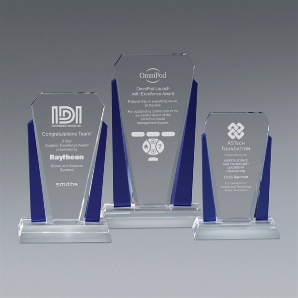 Celebrate milestones with this eye-catching award! Made of clear crystal, this award features a clear crystal base, rectangular shape, blue crystal accents and an etched imprint showcasing a brand name, logo, recipients name and accomplishments. An excellent way to recognize years of service, sales goal achievements, donor recognition, employee of the month programs and much more. Just think how good this will look in a trophy case or displayed on a desk!