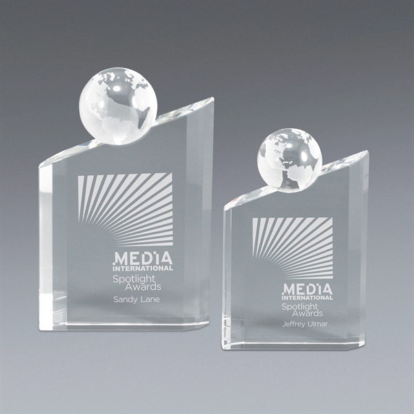 Acknowledge employees who go above and beyond for your company with our globe award. Available in two sizes, this dazzling upright award sits atop a clear crystal base and can be customized to your liking – etch your company name and logo, award title, recipient’s name and much more. Honor employees of the month, sales and volunteering excellence and more with this elegant accolade.