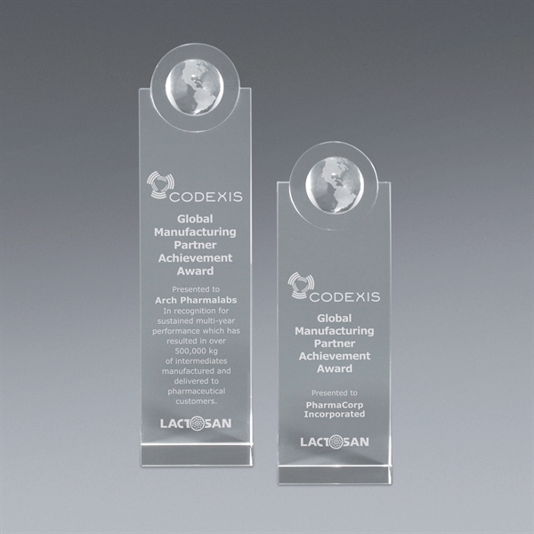 For those that tower above the competition, it’s only fitting to recognize them with an award that’s in a galaxy of its own! The Globe Tower upright award is made of clear crystal, is offered in two sizes (3″x9″, 3″x11″), and features a clear crystal base and world/globe design near the top. Include an etched company name and logo, award title, honoree’s name and much more, and then hand it out at the next awards ceremony, banquet, company party and any other event where recognition is warranted!