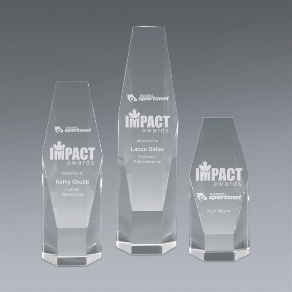 Recognize outstanding achievement in the corporate realm with this crystal hexagon tower upright award! Available in three sizes, this award sits on a clear crystal base. Have your company logo etched onto the surface along with the names of deserving recipients to create a keepsake that will be treasured forever. Your award winners will be glad to display this accolade for years to come!