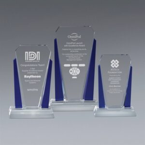 Celebrate milestones with this eye-catching award! Made of clear crystal, this award features a clear crystal base, rectangular shape, blue