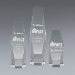 Recognize outstanding achievement in the corporate realm with this crystal hexagon tower upright award! Available in three sizes, this award