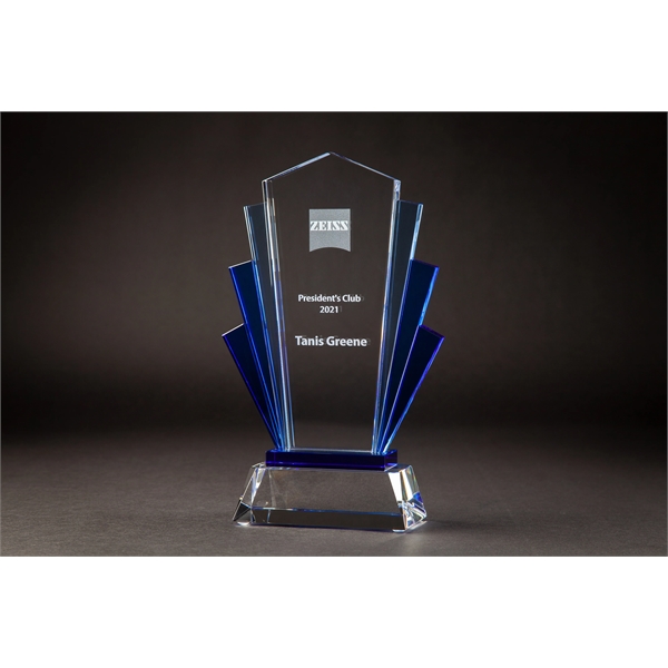 The Triple Spotlight Trophy showcases an elegant and unique crystal shape, mounted to a stunning crystal base. The blue spectrum of colors highlights the artwork and overall design, creating a standout award or trophy.