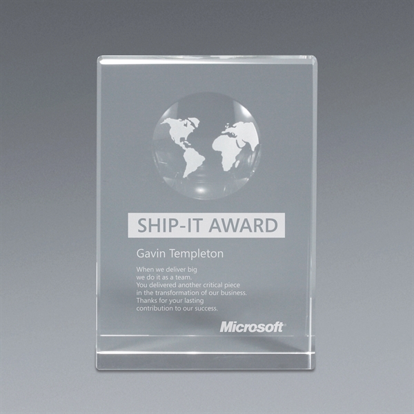 Acknowledge those who do a world of good for your business with this crystal world wedge upright award! It has an overall size of 5″W x 7″H. Perfect for celebrating anniversaries and employee milestones, have your company name and message of appreciation etched onto the surface to create a customized keepsake that will be cherished for years to come. Select this outstanding accolade for your upcoming banquet or ceremony!